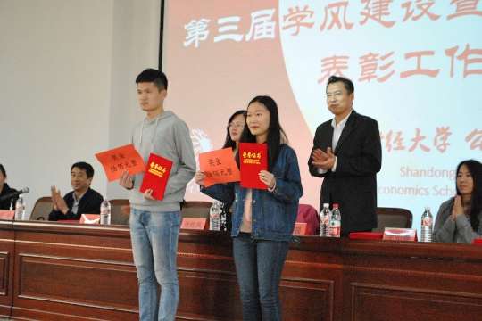 (通讯员:李昭娜 孙文静 贺慧敏 摄影:刘菁 郑璐) 3月29日下午,我们在明水校区5201召开了第三届学风建设暨学团工作表彰大会。院长张红凤、党委书记李国强、学生处副处长孙丽华、党委副书记周炎、团委书记王恩娟、辅导员李昭娜、张辉出席了会议。2016级学生代表以及2017级全体新生参加了此次会议。