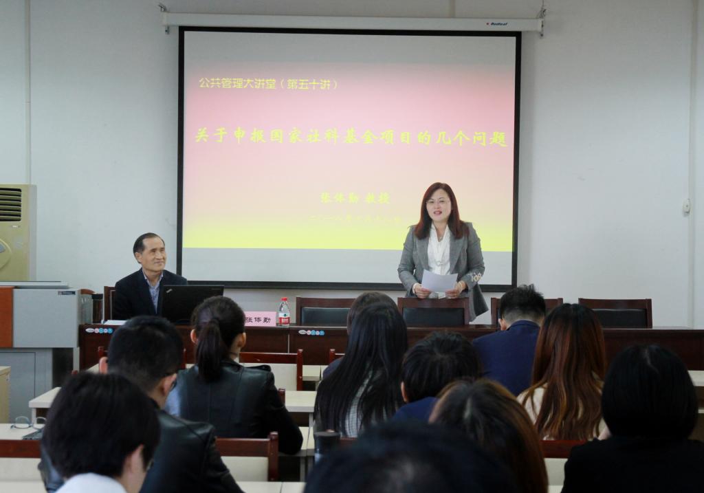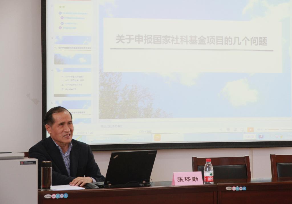 (通讯员 曲夏夏)10月18日下午,国家社科基金评审专家张体勤教授做客公共管理大讲堂,为全院教师献上了一场精彩的国家社科基金申报辅导讲座。张体勤教授从国家社科基金申报要求讲起,细致而深入地分析了课题名称凝练、选题依据、研究内容、思路方法、研究基础、条件保障等方面的写作方法和注意事项,用举例的方式深入浅出地剖析了项目申请的要义,为我们教师申报2019年国家社科基金项目指明了方向。讲座获得与会教师的热烈掌声。张红凤院长主持并总结了本场讲座,贾海彦副院长、路军副院长及我们科研骨干、教师代表列席参加。
