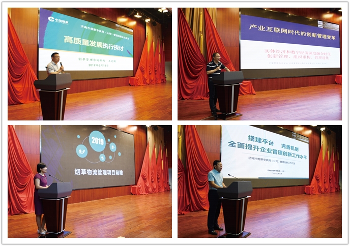 会议过程中,首先由济南市烟草专卖局局长宋洪润进行了会议致辞,宋局长介绍了烟草管理创新论坛举办的重大意义,对各位专家的到来表示了热列的欢迎。其次,济南市烟草专卖局刘洪涛副总经理做了论坛主旨演讲,刘经理就烟草专卖局开展管理创新工作的主要做法、工作成效和努力方向进行了重要汇报。接下来,大会进入主题报告环节,首先由王定国教授做了“烟草发展的地级市公司执行探讨”的主题报告,王教授阐述了高质量发展的指导思想和根本路径,为烟草企业健康、平稳、可持续发展提供了借鉴与参考。接着,王吉斌博士做了“产业互联网时代的创新管理变革”的主题报告,他分析了数字经济对企业竞争、创新管理与管理变革的挑战,探讨了大企业与初创企业所具备的创新优势。下午的会议报告中,首先,邹霞老师做了“烟草物流管理项目前瞻”的主题报告,邹老师展示了多个地区烟草物流管理运行存在的问题及解决方案,为烟草物流管理创新提供了丰富的案例借鉴。其次,山东达创公司高级咨询顾问孙延惠老师介绍了流程管理的理念与方法、企业数字化转型的形式与特征以及“互联网+”下的流程变革,并结合企业转型案例,详细论述了流程管理对烟草业管理模式创新的重要性,为深化烟草企业传统职能转换提供了理论支撑。接着,山东省企业家联合会秘书长赵彬做了企业管理创新方面的报告,阐述了创新与管理创新的理论内涵,分析了管理创新的思路与方法,展示了管理创新成果报告的撰写要点。最后,济南卷烟厂劳资培训处处长郭毅进行了济南卷烟厂工匠育成工作汇报交流,郭处长的报告从树匠心、育匠人、出精品等方面阐述了如何弘扬、传承与践行工匠精神。